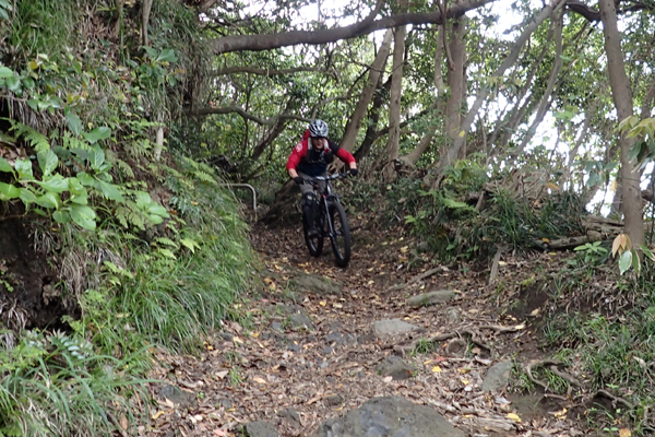 草、小枝、小岩、根っこ、木のツルが連続する見通しの悪いシングルトラックでは、路面状況の推測と、その状況における瞬時の対応が必要とされます。しかし、27.5+タイヤがもつ高い走破性とグリップ力、そしてよく働くサスペンションシステムのお陰で、いつもは緊張感バリバリのシングルトラックを、ほどよい緊張感というレベルで楽しむ事が出来ました。また、滑りやすいロックセクションにおいても同様、より多くのラインを選べるというメリットは大きく、以前苦戦したロックセクションも難なくクリア、悩んだらエイッヤッ!って行けちゃう感覚は実に楽しいもんですな。